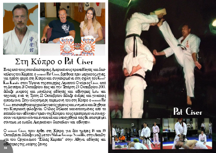 Ενας από τους σπουδαιότερους Αμερικάνους πρωταθλητές και δασ-κάλους του Καράτε, ο sensei Pat Ciser, βρέθηκε πριν μερικούς μήνες, για πρώτη φορά στη Κύπρο και συγκεκριμένα στη σχολή του Koei-Kan Karate στον Υψωνα της επαρχίας Λεμεσού. Ο κύριος Ciser, από τη Δευτέρα 21 Οκτωβρίου έως και την Τετάρτη 23 Οκτωβρίου 2013, δίδαξε μικρούς και μεγάλους αθλητές και αθλήτριες kata και τεχνικές, ενώ τη Τρίτη 22 Οκτωβρίου δίδαξε άνδρες και γυναίκες αυτοάμυνα. Στην ολιγοήμερη παραμονή του στη Κύπρο ο sensei Pat Ciser επισκέφθηκε αρχαιολογικούς χώρους και μνημεία και δέχθηκε την Κυπριακή φιλοξενία. Ο ίδιος δήλωσε ικανοποιημένος από το επίπεδο των αθλητών/τριών της Κύπρου, τους προέτρεψε να συνεχί-σουν να προπονούνται εντατικά και υποσχέθηκε πώς θα επιστρέψει σύντομα με ομάδα Αμερικάνων δασκάλων και αθλητών.