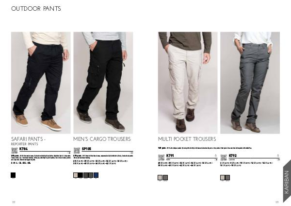 215 gsm • 100 % Cotton washed canvas. Elasticated waist with zip fly and button. Adjustable clip belt - 2 side pockets. 270 gsm • 100 % Peached Cotton Heavy Canvas, enzyme washed. Zip fly with button. Side leg, front and back pockets