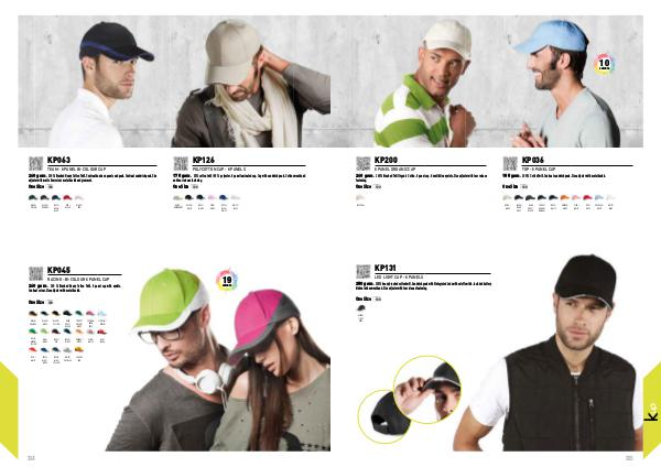 260 gsm • 100% Brushed Twill Organic Cotton. 6 panel cap. 6 ventilation eyelets. Size adjuster with tear release 155 gsm • 100 % Cotton Twill. Contrast sandwich peak. Size adjuster with metal buckle.
