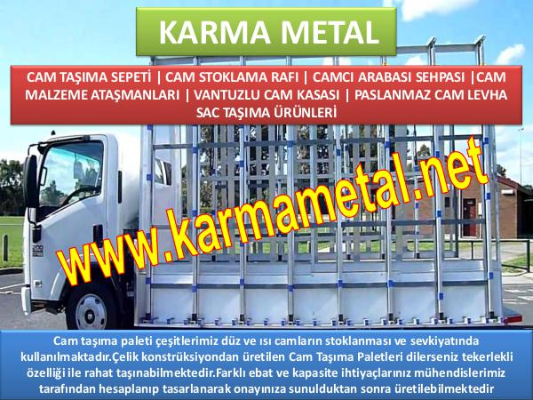 KARMA METAL CAM TAŞIMA SEPETİ | CAM STOKLAMA RAFI | CAMCI ARABASI SEHPASI |CAM MALZEME ATAŞMANLARI | VANTUZLU CAM KASASI | PASLANMAZ CAM LEVHA SAC TAŞIMA ÜRÜNLERİ Cam taşıma paleti çeşitlerimiz düz ve ısı camların stoklanması ve sevkiyatında kullanılmaktadır.Çelik konstrüksiyondan üretilen Cam Taşıma Paletleri dilerseniz tekerlekli özelliği ile rahat taşınabilmektedir.Farklı ebat ve kapasite ihtiyaçlarınız mühendislerimiz tarafından hesaplanıp tasarlanarak onayınıza sunulduktan sonra üretilebilmektedir