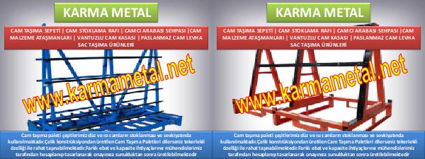 KARMA METAL CAM TAŞIMA SEPETİ | CAM STOKLAMA RAFI | CAMCI ARABASI SEHPASI |CAM MALZEME ATAŞMANLARI | VANTUZLU CAM KASASI | PASLANMAZ CAM LEVHA SAC TAŞIMA ÜRÜNLERİ Cam taşıma paleti çeşitlerimiz düz ve ısı camların stoklanması ve sevkiyatında kullanılmaktadır.Çelik konstrüksiyondan üretilen Cam Taşıma Paletleri dilerseniz tekerlekli özelliği ile rahat taşınabilmektedir.Farklı ebat ve kapasite ihtiyaçlarınız mühendislerimiz tarafından hesaplanıp tasarlanarak onayınıza sunulduktan sonra üretilebilmektedir