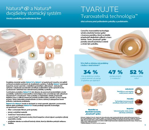 Dvojdielny stomický systém Natura ® + a Natura ® od spoločnosti ConvaTec má najširší sortiment produktov patriacich do dvojdielneho systému . Podložky Natura ® znamenajú bezpečné , presné uzavretie s niekoľkými počuteľnými „ kliknutiami “. Jednoduché upínanie a odopínanie zacvaknutím umožňuje používateľom rýchlo vymeniť vrecko a pokračovať v aktivitách bez odstraňovania podložky z pokožky .