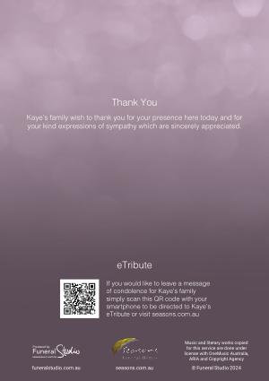 If you would like to leave a message of condolence for Kaye ’ s family simply scan this QR code with your smartphone to be directed to Kaye ’ s eTribute or visit seasons . com . au