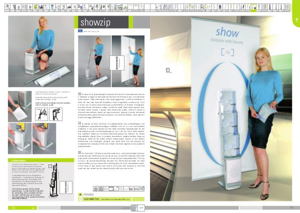 EN it‘s show time. 3 brochure pockets made of uv- and shock-resistant polycarbonate die-cast unfold easily to a brochure rack. mount the telescopic bar to the