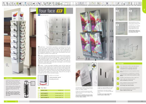 IT quattro facce – 4 possibilità di presentazione: il portadepliant da terra girevole four face presenta su ognuno dei suoi quattro lati dei pratici fori ai quali è possibile agganciare le tasche portabrochure magic. le tasche portadepliant in policarbonato antiurto sono disponibili in vari formati. sulla sua parte alta four face portadepliant possiede poi un ´ ulteriore tasca personalizzabile: basta stampare la grafica e inserirla su tutti e quattro i lati.