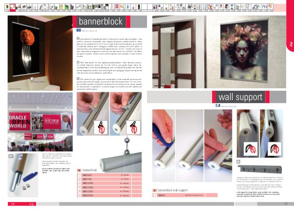 EN THE profile for your digital print presentation. silver anodized aluminium extrusions clamp the full length of your prints with thicknesses from 0,2 to 0,7mm. the synthetic eyelets included for suspension from ceiling can be simply clipped on. bannerblock is available in common lengths as 2 piece set with eyelets and convenient profile opener.