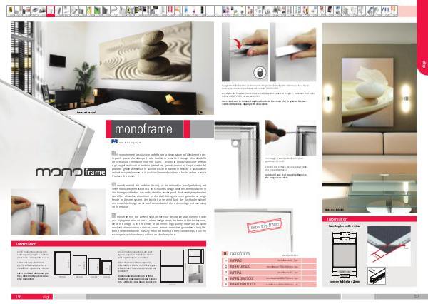 IT il monoframe è la soluzione perfetta per la decorazione e l’ allestimento delle pareti grazie alla stampa di alta qualità su tessuto. il design discreto della cornice lascia l’ immagine in primo piano. l ´ alluminio anodizzato color argento e gli angoli realizzati in metallo pressofuso garantiscono una lunga durata del prodotto. grazie alle strisce in silicone cucite al banner in tessuto la sostituzione dello stesso potrà avvenire in qualsiasi momento in modo facile, veloce e senza l ´ utilizzo di utensili.