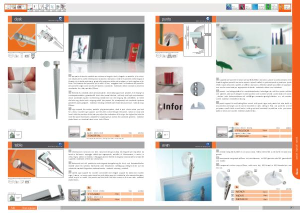 4 it supporto da tavolo variabile con sistema a brugola. desk, elegante e variabile, è la soluzione ideale per le vostre informazioni da tavolo e da banco. inserire il pannello nella brugola e fissarlo con la testina anteriore. grazie alla posizione del foro da praticare, si puó scegliere e definire l’ inclinazione del pannello: piú in alto è il foro, maggiore sarà l’ inclinazione del pannello. per pannelli singoli come anche per sistemi a sandwich. materiale: ottone cromato o alluminio anodizzato. foro del pannello: Ø4mm.