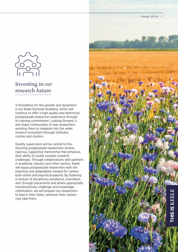 Quality supervision will be central to this, ensuring postgraduate researchers receive rigorous, supportive mentorship that enhances their ability to tackle complex research challenges. Through collaborations with partners in academia, industry and other sectors, Keele will equip postgraduate researchers with the expertise and adaptability needed for careers both within and beyond academia. By fostering a mixture of disciplinary excellence, innovation, and, through placements and where appropriate, interdisciplinary challenge and knowledge mobilisation, we will prepare our researchers to lead in their fields, wherever their careers may take them.
