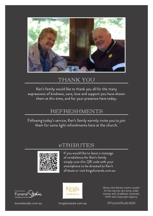 If you would like to leave a message of condolence for Ken ’ s family simply scan this QR code with your smartphone to be directed to Ken ’ s eTribute or visit kingsfunerals . com . au