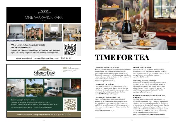The Secret Garden , nr Ashford A secret hideaway with beautiful views over its Victorian walled garden , this is the perfect place to enjoy homemade afternoon tea and cakes . Indulge in the Garden ’ s famous sausage rolls , Scotch eggs and cheese scones at this one-of-a-kind location . There are several afternoon teas to choose from .