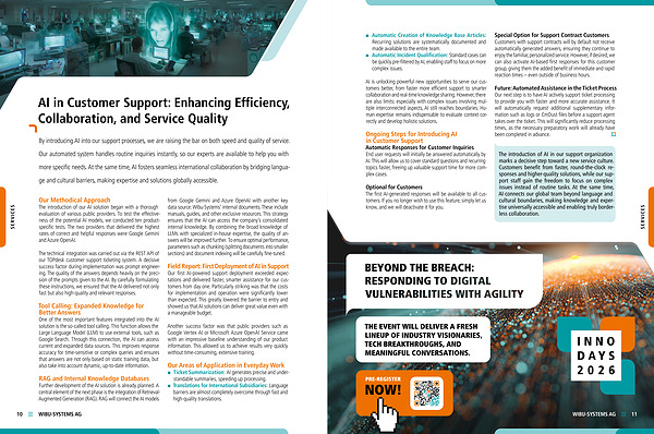 Further development of the AI solution is already planned. A central element of the next phase is the integration of Retrieval- Augmented Generation( RAG). RAG will connect the AI models from Google Gemini and Azure OpenAI with another key data source: Wibu-Systems’ internal documents. These include manuals, guides, and other exclusive resources. This strategy ensures that the AI can access the company’ s consolidated internal knowledge. By combining the broad knowledge of LLMs with specialized in-house expertise, the quality of answers will be improved further. To ensure optimal performance, parameters such as chunking( splitting documents into smaller sections) and document indexing will be carefully fine-tuned.