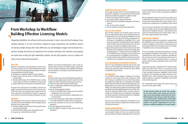Integrating CodeMeter into software and business processes is never a one-size-fits-all endeavor. Every company operates in its own environment, shaped by unique requirements and workflows. Successful licensing models emerge when these differences are acknowledged, mapped, and translated into a coherent strategy. Drawing on our experience from countless workshops with customers and prospects, we outline how to bring the right stakeholders together, ask the right questions, and turn insights into