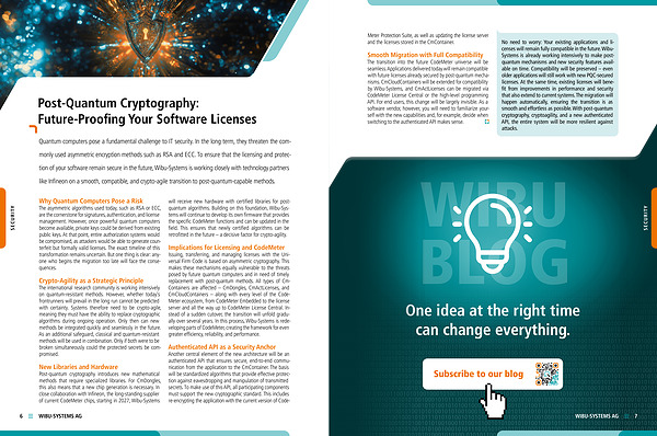 The transition into the future CodeMeter universe will be seamless. Applications delivered today will remain compatible with future licenses already secured by post-quantum mechanisms. CmCloudContainers will be extended for compatibility by Wibu-Systems, and CmActLicenses can be migrated via CodeMeter License Central or the high-level programming API. For end users, this change will be largely invisible. As a software vendor, however, you will need to familiarize yourself with the new capabilities and, for example, decide when switching to the authenticated API makes sense.