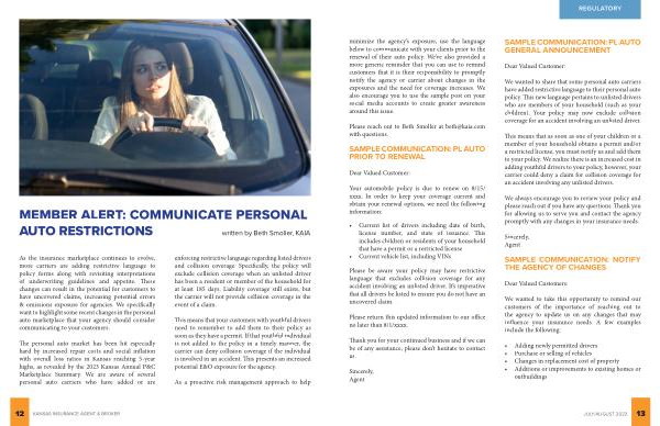 MEMBER ALERT : COMMUNICATE PERSONAL AUTO RESTRICTIONS written by Beth Smoller , KAIA