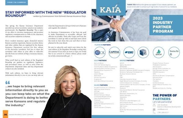 STAY INFORMED WITH THE NEW “ REGULATOR ROUNDUP ” written by Commissioner Vicki Schmidt , Kansas Insurance Dept .