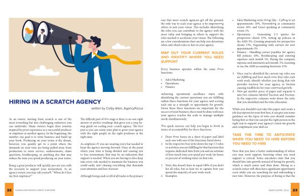 way that most scratch agencies get off the ground , the only way to scale your agency is by empowering others to join your vision . This includes Identifying the roles you can contribute to the agency with the most value and bringing in others to support the roles needed to accelerate your vision . The following are a few considerations that can help you determine when and which roles to hire in your agency .