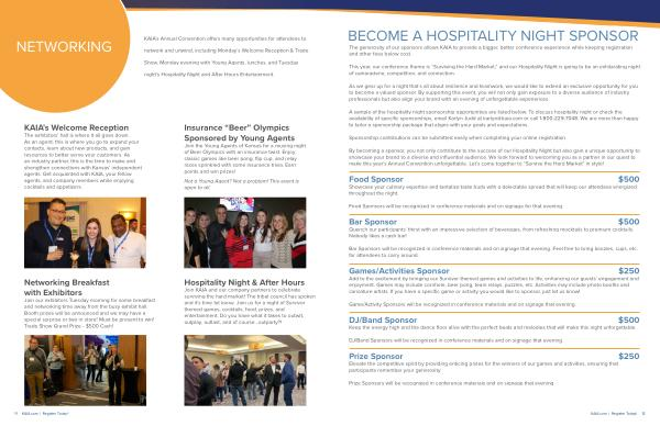 KAIA ’ s Annual Convention offers many opportunities for attendees to network and unwind , including Monday ’ s Welcome Reception & Trade Show , Monday evening with Young Agents , lunches , and Tuesday night ’ s Hospitality Night and After Hours Entertainment .
