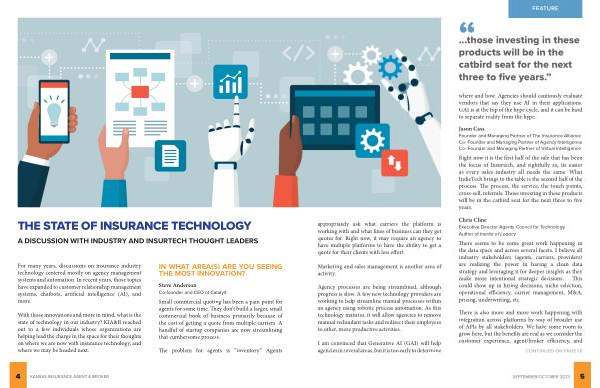 With those innovations and more in mind , what is the state of technology in our industry ? KIA & B reached out to a few individuals whose organizations are helping lead the charge in the space for their thoughts on where we are now with insurance technology , and where we may be headed next .