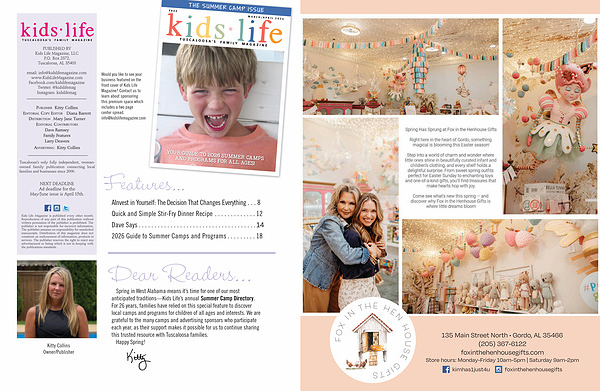 Spring in West Alabama means it’ s time for one of our most anticipated traditions— Kids Life’ s annual Summer Camp Directory. For 26 years, families have relied on this special feature to discover local camps and programs for children of all ages and interests. We are grateful to the many camps and advertising sponsors who participate each year, as their support makes it possible for us to continue sharing this trusted resource with Tuscaloosa families.