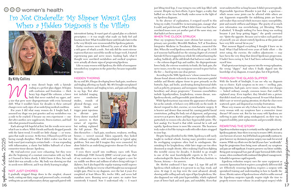 In the absence of explanations, I resigned myself to this being my reality. I would live in increasing pain, manage what I could, and push forward. What I didn’ t know was that these unrelated issues were yet another part of the same story, one that hadn’ t yet been named. WHEN THE CLOCK STRUCK Once my symptoms became more obvious last summer, my primary care provider, Meredith Madison, N. P. at Tuscaloosa Integrative Medicine in Tuscaloosa, Alabama, connected the dots. When the word lipedema entered my life at age 51, it felt as if someone had handed me the missing chapter of a twisted fairytale I’ d been trapped in my whole life without knowing the ending. Suddenly, all the odd details that had never made sense— the column-shaped legs and cankles, the disproportionate lower body, the extreme sensitivity to foods, the back pain, the nerve issues, even the way menopause seemed to pour fuel on the fire— lined up into one clear picture.