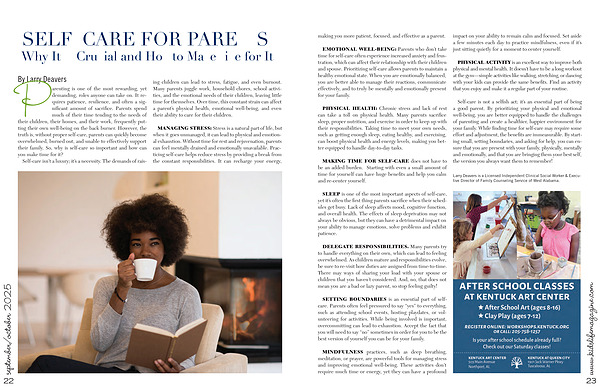 MANAGING STRESS: Stress is a natural part of life, but when it goes unmanaged, it can lead to physical and emotional exhaustion. Without time for rest and rejuvenation, parents can feel mentally drained and emotionally unavailable. Practicing self-care helps reduce stress by providing a break from the constant responsibilities. It can recharge your energy, september / october 2025