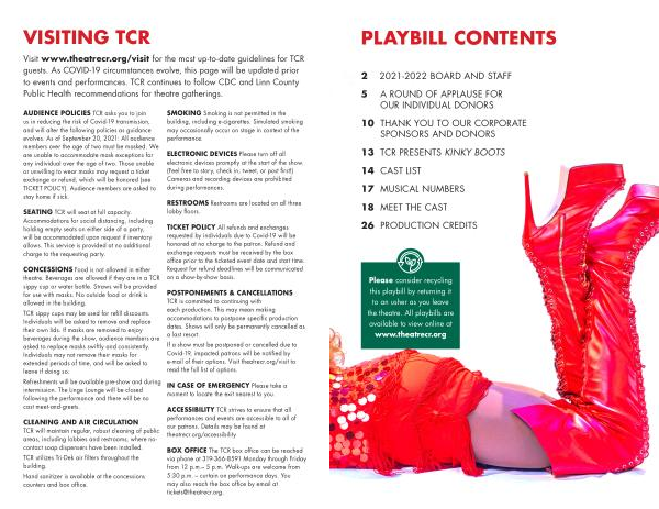 Visit www . theatrecr . org / visit for the most up-to-date guidelines for TCR guests . As COVID-19 circumstances evolve , this page will be updated prior to events and performances . TCR continues to follow CDC and Linn County Public Health recommendations for theatre gatherings .