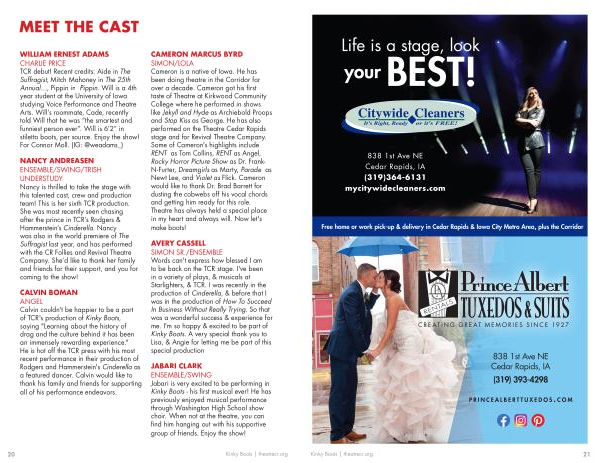 CALVIN BOMAN ANGEL Calvin couldn ' t be happier to be a part of TCR ' s production of Kinky Boots , saying " Learning about the history of drag and the culture behind it has been an immensely rewarding experience ." He is hot off the TCR press with his most recent performance in their production of Rodgers and Hammerstein ' s Cinderella as a featured dancer . Calvin would like to thank his family and friends for supporting all of his performance endeavors .