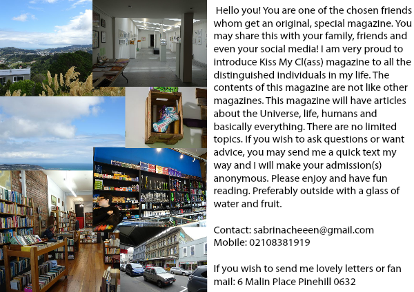 Hello you! You are one of the chosen friends whom get an original, special magazine. You may share this with your family, friends and even your social media! I am very proud to introduce Kiss My Cl(ass) magazine to all the distinguished individuals in my life. The contents of this magazine are not like other magazines. This magazine will have articles about the Universe, life, humans and basically everything. There are no limited topics. If you wish to ask questions or want advice, you may send me a quick text my way and I will make your admission(s) anonymous. Please enjoy and have fun reading. Preferably outside with a glass of water and fruit.