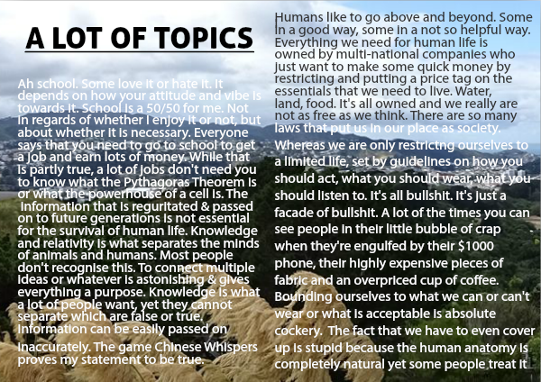 should listen to. It's all bullshit. It's just a facade of bullshit. A lot of the times you can see people in their little bubble of crap when they're engulfed by their $1000 phone, their highly expensive pieces of fabric and an overpriced cup of coffee.