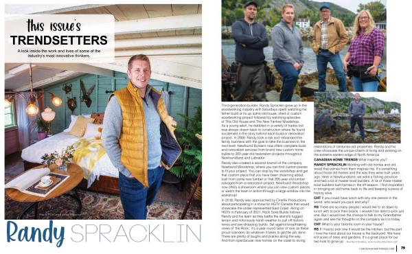 RANDY SPRACKLIN Working with old homes and old wood that comes from them inspires me . It ’ s something about those old homes and the way they were built years ago . Here in Newfoundland , we were a fishing province and had a lot of master boat builders . A lot of those master boat builders built homes in the off-season . I find inspiration in bringing an old home back to life and keeping a piece of history alive .
