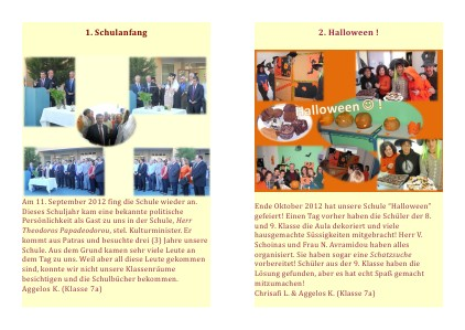 Am 11. September 2012 fing die Schule wieder an. Dieses Schuljahr kam eine bekannte politische Persönlichkeit als Gast zu uns in der Schule, Herr Theodoros Papadeodorou, stel. Kulturminister. Er kommt aus Patras und besuchte drei( 3) Jahre unsere Schule. Aus dem Grund kamen sehr viele Leute an dem Tag zu uns. Weil aber all diese Leute gekommen sind, konnte wir nicht unsere Klassenräume besichtigen und die Schulbücher bekommen. Aggelos K.( Klasse 7a)