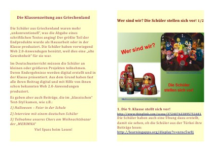 Die Schüler aus Griechenland waren mehr „ unkonventionell“, was die Abgabe eines schriftlichen Textes anging! Der größte Teil der Endprodukte wurde als Hausarbeit oder in der Klasse produziert. Die Schüler haben vorwiegend Web 2.0-Anwendugen benützt, weil dies eine „ alte Gewohnheit“ für sie war.