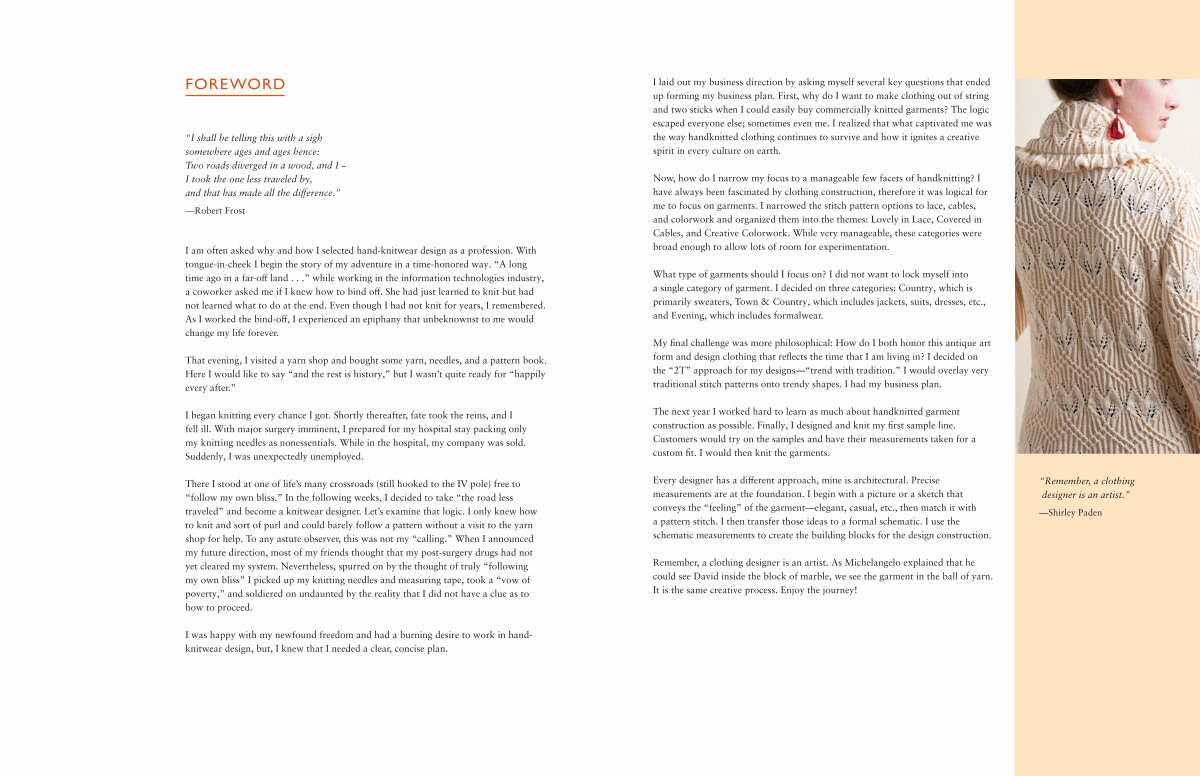 There I stood at one of life’ s many crossroads( still hooked to the IV pole) free to“ follow my own bliss.” In the following weeks, I decided to take“ the road less traveled” and become a knitwear designer. Let’ s examine that logic. I only knew how to knit and sort of purl and could barely follow a pattern without a visit to the yarn shop for help. To any astute observer, this was not my“ calling.” When I announced my future direction, most of my friends thought that my post-surgery drugs had not yet cleared my system. Nevertheless, spurred on by the thought of truly“ following my own bliss” I picked up my knitting needles and measuring tape, took a“ vow of poverty,” and soldiered on undaunted by the reality that I did not have a clue as to how to proceed.