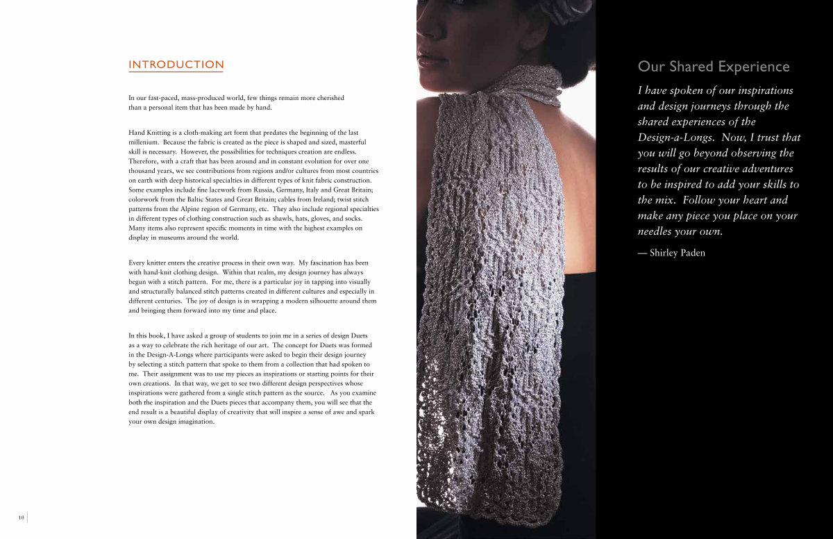 In this book, I have asked a group of students to join me in a series of design Duets as a way to celebrate the rich heritage of our art. The concept for Duets was formed in the Design-A-Longs where participants were asked to begin their design journey by selecting a stitch pattern that spoke to them from a collection that had spoken to me. Their assignment was to use my pieces as inspirations or starting points for their own creations. In that way, we get to see two different design perspectives whose inspirations were gathered from a single stitch pattern as the source. As you examine both the inspiration and the Duets pieces that accompany them, you will see that the end result is a beautiful display of creativity that will inspire a sense of awe and spark your own design imagination.