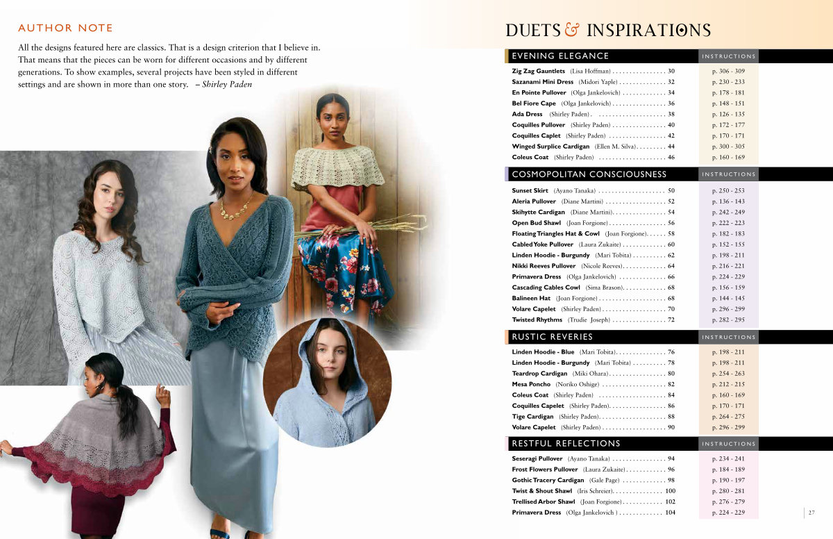 All the designs featured here are classics. That is a design criterion that I believe in. That means that the pieces can be worn for different occasions and by different generations. To show examples, several projects have been styled in different settings and are shown in more than one story. – Shirley Paden