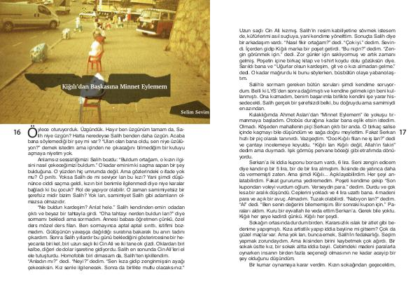 “ Ne buldun kardeşim? Anlat hele.” Salih kendinden emin odadan çıktı ve beyaz bir tahtayla girdi.“ Oha tahtayı nerden buldun lan?” diye sormamı bekledi ama sormadım. Annesi babası öğretmen çünkü, özel ders mözel ders filan. Ben sormayınca aptal aptal sırıttı, istifimi bozmadım. Gülüşünün yavaşça dağıldığı suratına bakarak bu anın tadını çıkardım. Sonra Salih yıllardır bu günü beklediğini gösterircesine bir heyecanla biri kel, biri uzun saçlı iki Cin Ali ve iki tane ok çizdi. Oklardan biri kalbe, diğeri de dolar işaretine gidiyordu. Salih en sonunda Cin Ali’ leri el ele tutuşturdu. Homofobik biri olmasam da, Salih’ ten işkillendim.“ Anladın mı?” dedi.“ Neyi?” dedim.“ Sen kıza gidip zenginmişsin ayağı çekeceksin. Kız senle ilgilenecek. Sonra da birlikte mutlu olacaksınız.”