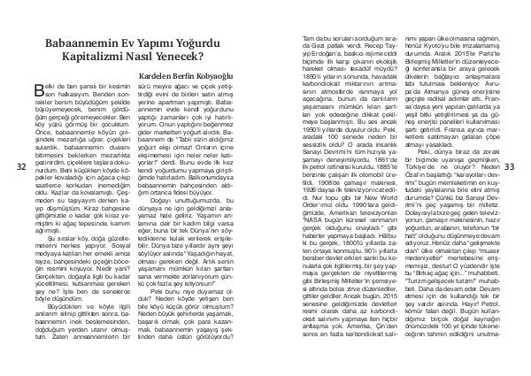 Tam da bu soruları sorduğum sırada Gezi patlak verdi. Recep Tayyip Erdoğan’ a, baskıcı rejime ciddi biçimde ilk karşı çıkanın ekolojik hareket olması tesadüf müydü? 1850’ li yılların sonunda, havadaki karbondioksit miktarının artmasının atmosferde ısınmaya yol açacağına, bunun da canlıların yaşamasını mümkün kılan şartları yok edeceğine dikkat çekilmeye başlanmıştı. Bu ses ancak 1950’ li yıllarda duyulur oldu. Peki, aradaki 100 senede neden bir sessizlik oldu? O arada insanlık Sanayi Devrimi’ ni tüm hızıyla yaşamayı deneyimliyordu. 1861’ de ilk petrol rafinerisi kuruldu, 1885’ te benzinle çalışan ilk otomobil üretildi, 1908’ de çamaşır makinesi, 1926’ daysa ilk televizyon icat edildi. Nur topu gibi bir New World Order’ ımız oldu. 1990’ lara geldiğimizde, Amerikan televizyonları“ NASA bugün küresel ısınmanın gerçek olduğunu onayladı.” gibi haberler yapmaya başladı. Hâlbuki bu gerçek, 1800’ lü yıllarda zaten ortaya konmuştu. 90’ lı yıllarla beraber devlet erkleri sanki bu konularla çok ilgililermiş, bir şey yapmaya gerçekten de niyetlilermiş gibi Birleşmiş Milletler’ in şemsiyesi altında bolca zirve düzenlediler, gittiler geldiler. Ancak bugün, 2015 senesine geldiğimizde devletleri resmi olarak daha az karbondioksit salınımı yapmaya iten hiçbir antlaşma yok. Amerika, Çin’ den sonra en fazla karbondioksit salınımı yapan ülke olmasına rağmen, henüz Kyoto’ yu bile imzalamamış durumda. Aralık 2015’ te Paris’ te Birleşmiş Milletler’ in düzenleyeceği konferansla bir araya gelecek ülkelerin bağlayıcı anlaşmalara tabi tutulması bekleniyor. Avrupa’ da Almanya güneş enerjisine geçişte radikal adımlar attı, Fransa’ daysa yeni yapılan çatılarda ya yeşil bitki yetiştirilmesi ya da güneş enerjisi panelleri kullanılması şartı getirildi. Fransa ayrıca marketlere satılmayan gıdaları çöpe atmayı yasakladı.