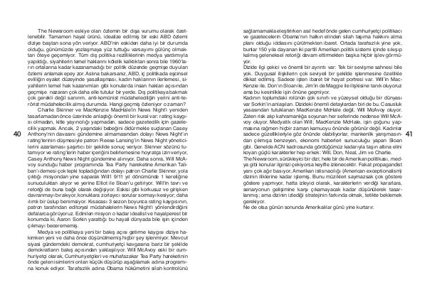 sağlamamakla eleştirirken asıl hedef önde gelen cumhuriyetçi politikacı ve gazetecelerin Obama’ nın halkın elinden silah taşıma hakkını alma planı olduğu iddiasını çürütmekten ibaret. Ortada tarafsızlık yine yok, bunlar 150 yıla dayanan iki partili Amerikan politik sistemi içinde sıkışıp kalmış geleneksel retoriği devam ettirmekten başka hiçbir işlev görmüyor. Dizide ilgi çekici ve önemli bir ayrıntı var: Tek bir sevişme sahnesi bile yok. Duygusal ilişkilerin çok seviyeli bir şekilde işlenmesine özellikle dikkat edilmiş. Sadece işten ibaret bir hayat portresi var. Will’ in Mac- Kenzie ile, Don’ ın Sloan ile, Jim’ in de Maggie ile ilişkisine tanık oluyoruz ama bu kesinlikle işin önüne geçmiyor. Kadının toplumdaki rolünün çok sınırlı ve yüzeysel olduğu bir dünyası var Sorkin’ in anlaşılan. Dizideki önemli detaylardan biri de bu. Casusluk yasasından tutuklanan MacKenzie McHale değil, Will McAvoy oluyor. Zaten risk alıp kahramanlığa soyunan her seferinde nedense Will McAvoy oluyor. Medyatik olan Will; MacKenzie McHale, işin çoğunu yapmasına rağmen hiçbir zaman kamuoyu önünde görünür değil. Kadınlar sadece güzellikleriyle göz önünde olabiliyorlar, mankenlik yarışmasından çıkmışa benzeyen, ekonomi haberleri sunuculuğu yapan Sloan gibi. Genelde ACN kadrosunda gördüğümüz kadarıyla taşın altına elini koyan güçlü karakterler hep erkek: Will, Don, Neal, Jim ve Charlie. The Newsroom, sürükleyici bir dizi; hele bir de Amerikan politikası, medya gibi konular ilginizi çekiyorsa keyifle izlenecektir. Fakat propagandist yanı çok ağır basıyor, Amerikan istisnacılığı( American exceptionalism) dizinin iliklerine kadar işlemiş. Bunu müzikleri saymazsak çok göstere göstere yapmıyor, hatta izleyici olarak, karakterlerin verdiği kararlara, senaryonun gelişimine karşı çıkamayacak kadar düşünülerek tasarlanmış; ama dizinin izlediği stratejinin farkında olmak, tetikte beklemek gerekiyor. Ne de olsa günün sonunda Amerikalılar günü yine kurtarır.