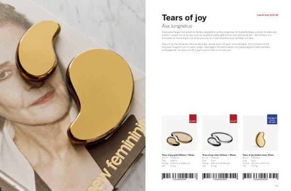 Tears of Joy har lanserats i flera avrättningar, senast silver och guld i borosilikatglas. En ny funktion är att ena sidan fungerar som en subtil spegel, vilket lägger till funktionalitet och mångsidighet till den estetiska överklagandet. Nu säljs som ett 2-pack med en liten och en stor del.