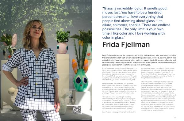 Frida Fjellman is among the contemporary artists and designers who have contributed to the renewal of Swedish craft-driven art over the past decade . Her bold , colorful , sometimes radical style in glass , ceramics and other materials has celebrated triumphs in Sweden and internationally – especially in the US , where in recent years Fjellman has completed several prestigious public commissions for clients such as Art Basel .