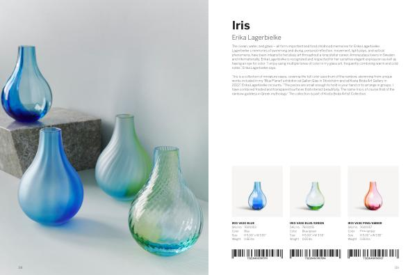 “ Iris is a collection of miniature vases , covering the full color spectrum of the rainbow , stemming from unique works included in my ‘ Blue Planet ’ exhibition at Galleri Glas in Stockholm and at Kosta Boda Art Gallery in 2022 ”, Erika Lagerbielke recounts . “ The pieces are small enough to hold in your hand or to arrange in groups . I have combined frosted and transparent surfaces that interact beautifully . The name Iris is of course that of the rainbow goddess in Greek mythology .” The collection is part of Kosta Boda Artist Collection .