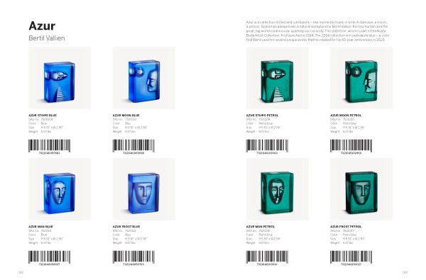 Azur is a collection of cast and cut objects – like moments frozen in time . A staircase , a moon , a person . Space has always been a natural workplace for Bertil Vallien : the tiny human and the great , big world continuously sparking our curiosity . The collection , which is part of the Kosta Boda Artist Collection , first launched in 2018 . The 2024 collection is in petroleum blue – a color that Bertil used for several unique works that he created for his 60-year anniversary in 2023 .