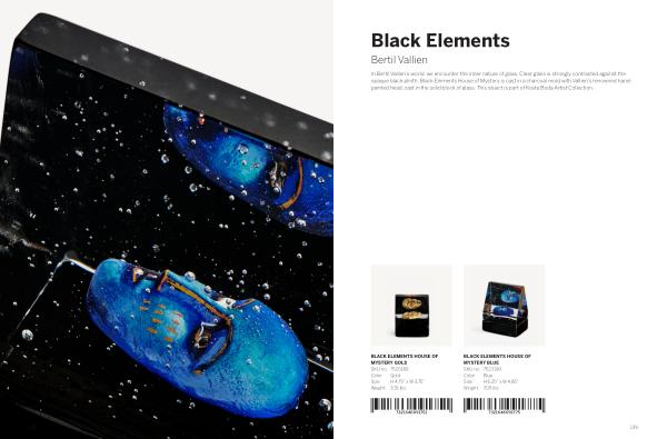 In Bertil Vallien ’ s world , we encounter the inner nature of glass . Clear glass is strongly contrasted against the opaque black plinth . Black Elements House of Mystery is cast in a charcoal mold with Vallien ’ s renowned handpainted head , cast in the solid block of glass . This object is part of Kosta Boda Artist Collection .