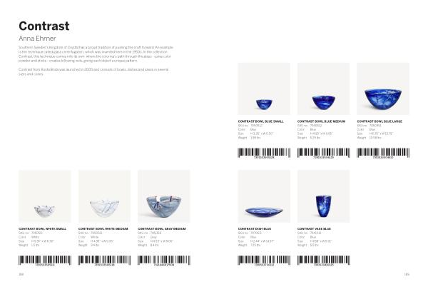 Southern Sweden ’ s Kingdom of Crystal has a proud tradition of pushing the craft forward . An example is the technique called glass centrifugation , which was invented here in the 1950s . In the collection Contrast , this technique comes into its own , where the coloring ’ s path through the glass - using color powder and sticks - creates billowing veils , giving each object a unique pattern .