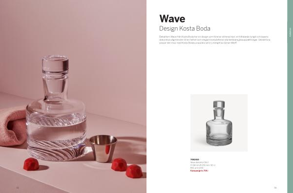 Dekantern Wave från Kosta Boda har en design som förenar stilrena linjer , en tilltalande tyngd och basens dekorativa vågmönster till en helhet som elegant kompletterar alla tänkbara glasuppsättningar . Särskilt bra passar den ihop med Kosta Bodas populära serie Limelight av Göran Wärff .
