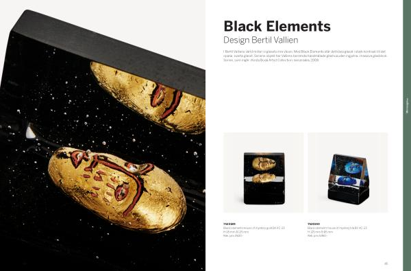 I Bertil Valliens värld möter vi glasets inre väsen . Med Black Elements står det klara glaset i stark kontrast till det opaka , svarta glaset . Seriens objekt har Valliens berömda handmålade glashuvuden ingjutna i massiva glasblock . Serien , som ingår i Kosta Boda Artist Collection , lanserades 2008 .
