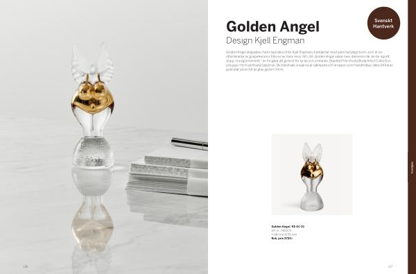 Golden Angel skapades med inspiration från Kjell Engmans baddamer med samma fylliga form, som är en efterliknelse av gospelkvinnor från en av hans resor till USA. Golden Angel vakar över damerna när de tar sig ett dopp i morgonmörkret- en fin gåva att ge bort för lycka och omtanke. Objektet från Kosta Boda Artist Collection pressas i form på Kosta Glasbruk. De blästrade vingarna är påklippta och kroppen som handmålas i äkta 24 karat guld står på en fot av glas gjuten i form.