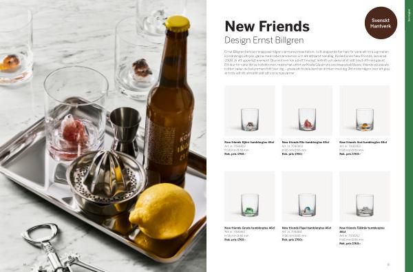 Ernst Billgren behöver knappast någon närmare presentation. I sitt skapande har han för vana att röra sig mellan konstnärliga uttryck, gärna med naturnära teman och ett lättsamt handlag. Kollektionen New Friends, lanserad 2008, är ett ypperligt exempel. Djurmotiven har på ett finurligt, lekfullt och dekorativt sätt blivit ett med glaset. Ett djur för varje del av kollektionen, mästerligt utfört av Kosta Glasbruks skickliga glasblåsare. Vilande på glasets botten vakar de bekymmersfritt över dig – glada att få dela den här drinken med dig. Att möta någon över ett glas är trots allt ett utmärkt sätt att vinna nya vänner.