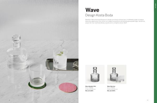 Dekantern Wave från Kosta Boda har en design som förenar stilrena linjer, en tilltalande tyngd och basens dekorativa vågmönster till en helhet som elegant kompletterar alla tänkbara glasuppsättningar. Särskilt bra passar den ihop med Kosta Bodas populära serie Limelight av Göran Wärff.